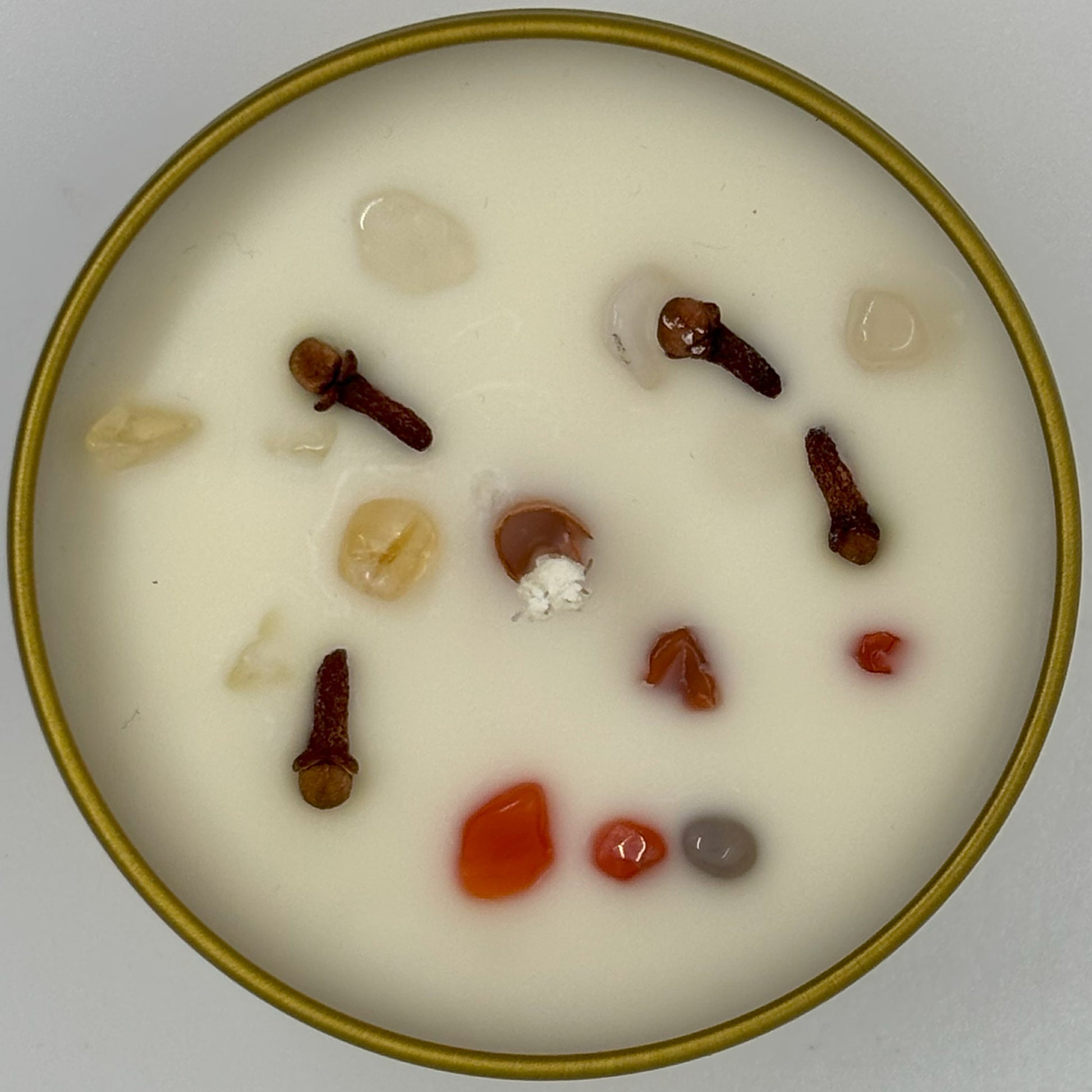 This candle is prepared with pumpkin to provide a sense of calm and vanilla to create happy homes and human connection. These warm and welcoming scents reduce stress and anxiety. This candle is infused with natural essential oils, including clove leaf, cedarwood, cypress, and cinnamon bark to strengthen your sense of self and knowledge of your own importance and power. Cinnamon prepares us for possibility by stoking creativity and summoning victorious success, while clove attracts friendship, love and prosperity.