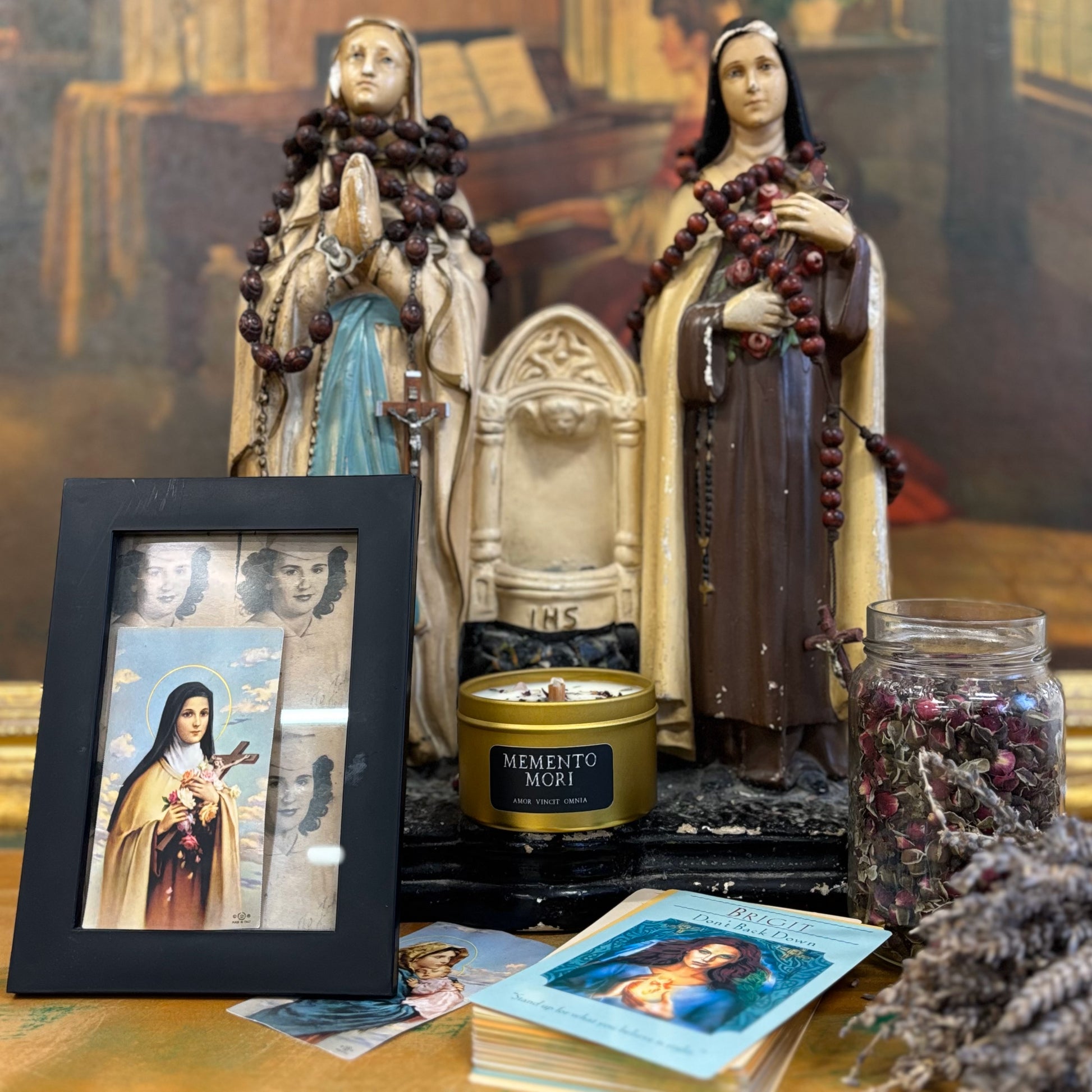 Memento Mori is prepared with rose oil, one of the highest vibrating florals, to open the heart and connect with loving energy and the angelic realm. The relaxing scent of lavender aids in quieting the mind and focus. Sandalwood is believed to help transition the soul into the next life and carry messages in between the realms. Myrtle is used to uplift vibration while lilac is for protection. Carnation is used to hold death at bay and was also the favorite flower of James’ beloved grandmother, Theresa.