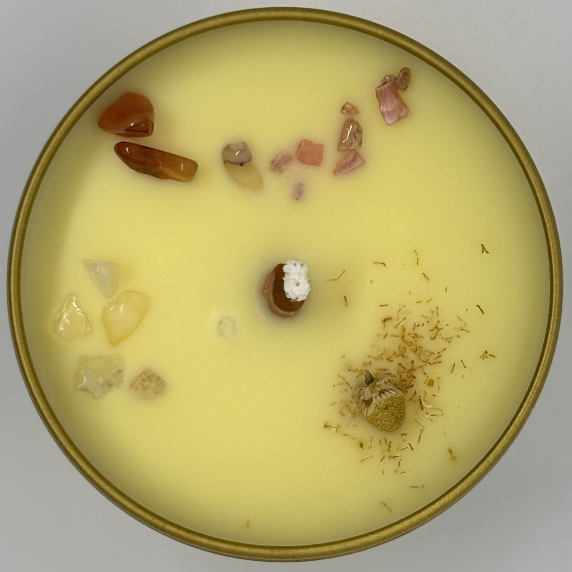 We have finished this Sacred Ceremony Candle with citrine, sunstone, and pink opal to allow everything to be illuminated and achieved and to celebrate the sun. Helichrysum is the flower of healing, empowering light and everlasting love.
