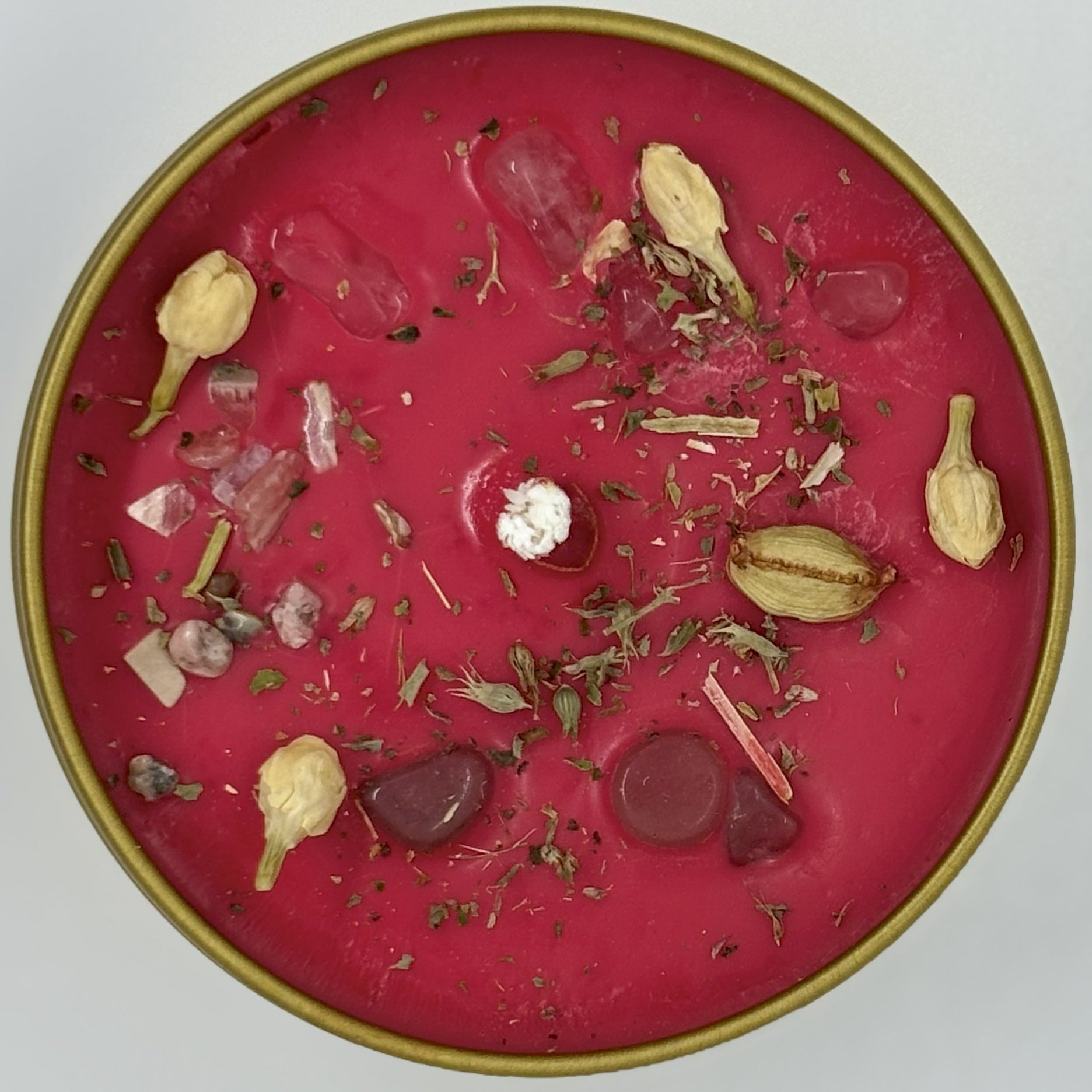 This candle is finished with Rose Quartz to invite love, Amazonite to increase consideration, and Rhodochrosite to release any pain from past relationships in anticipation of embracing love and beauty. A sprinkle of Catnip is added to keep romance alive and Cardamom to bring forward lust, love and fidelity. The arousing scent of jasmine fosters the courage to pursue the person you desire. Lastly, Damiana, the love herb, increases stamina and is widely recognized as an aphrodisiac.