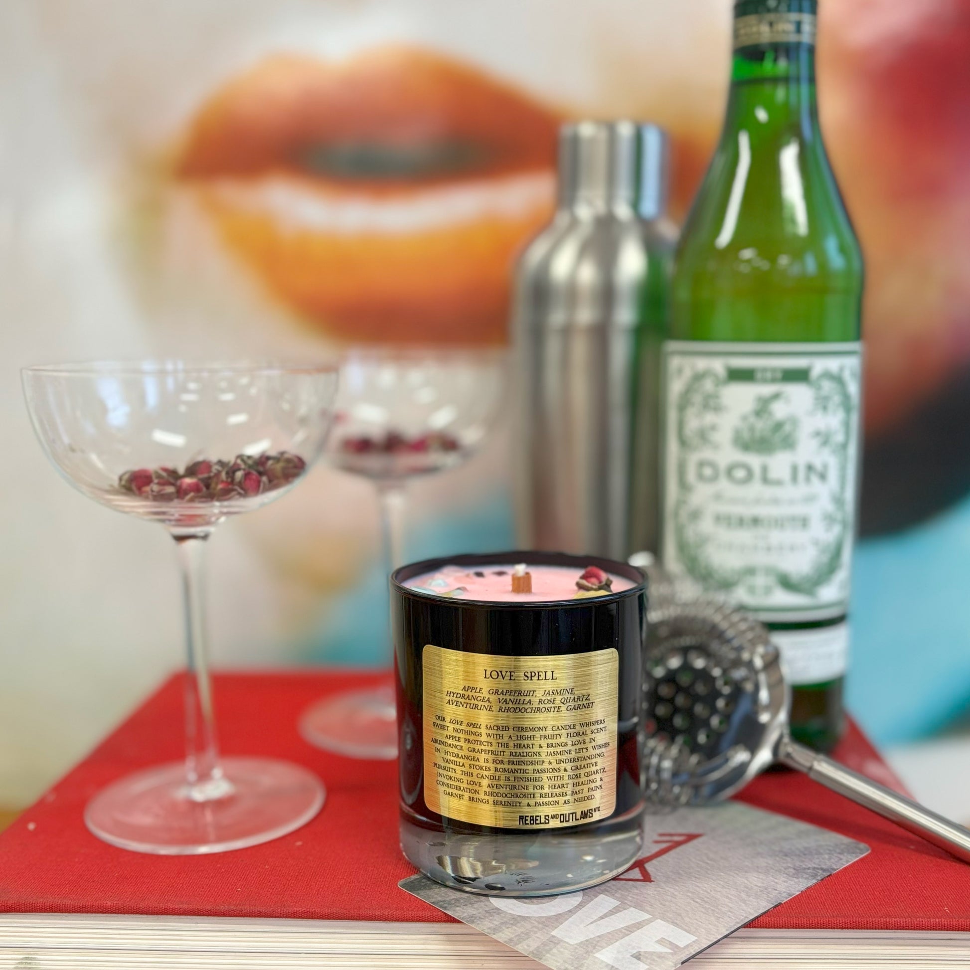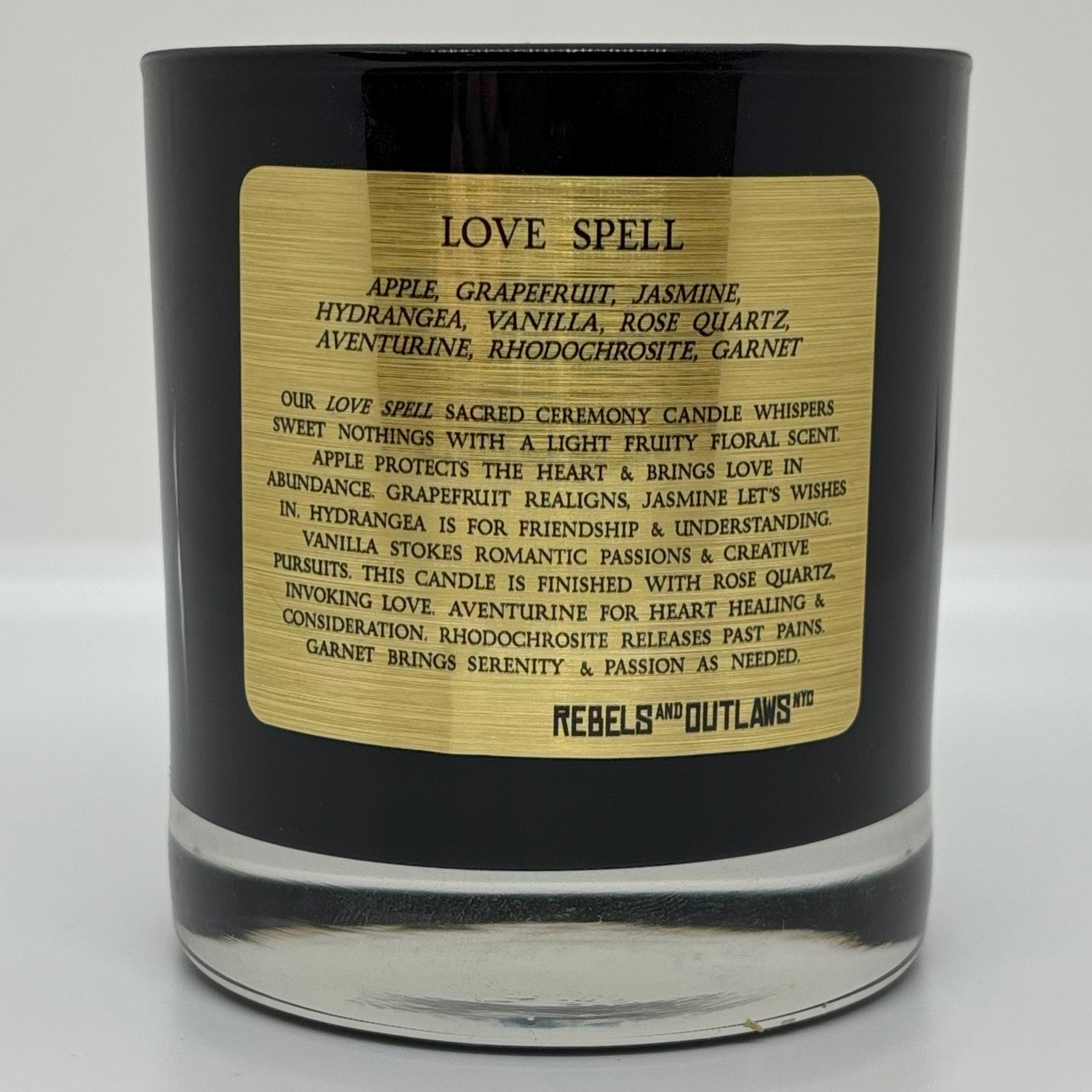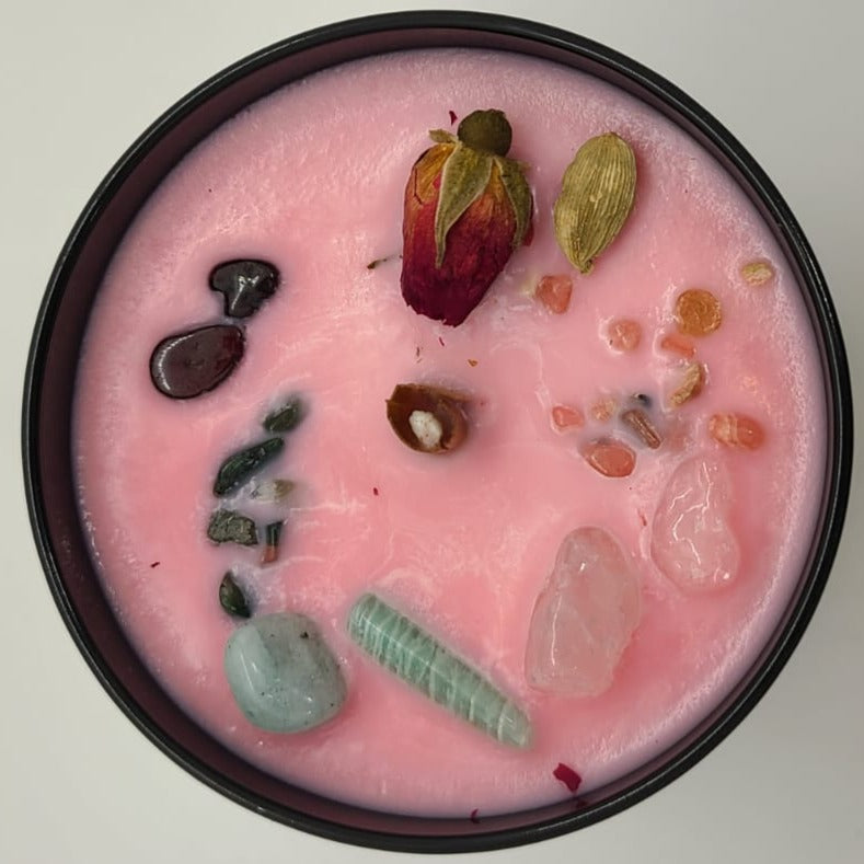 Our Love Spell Sacred Ceremony Candle whispers sweet nothings with a light fruity floral scent. Apple protects the heart & brings love in abundance. Grapefruit realigns, Jasmine let's wishes in. Hydrangea is for friendship & understanding. Vanilla stokes romantic passions & creative pursuits. This candle is finished with Rose Quartz, invoking love. Aventurine for heart healing & consideration. Rhodochrosite releases past pains. Garnet brings serenity & passion as needed.
