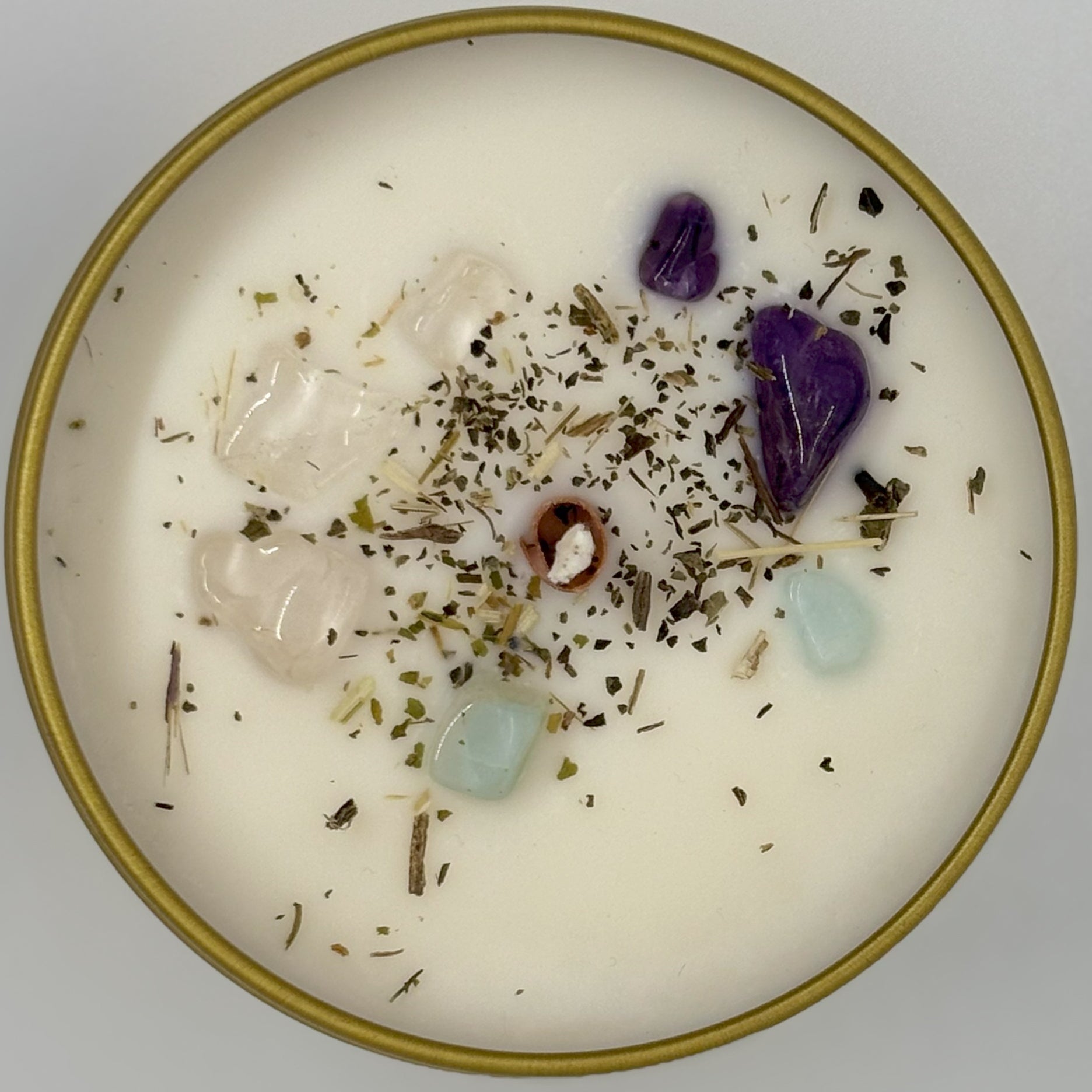 This candle is prepared with blessed inspiration, poured with the best intention and finished with amazonite to soothe trauma, worry and fear and amethyst to heal the healers. Malachite is added to restore balance. Smokey quartz clears and cleanses allowing empaths, creatives and everyone to focus, take care of themselves and find balance and beauty in compassion.