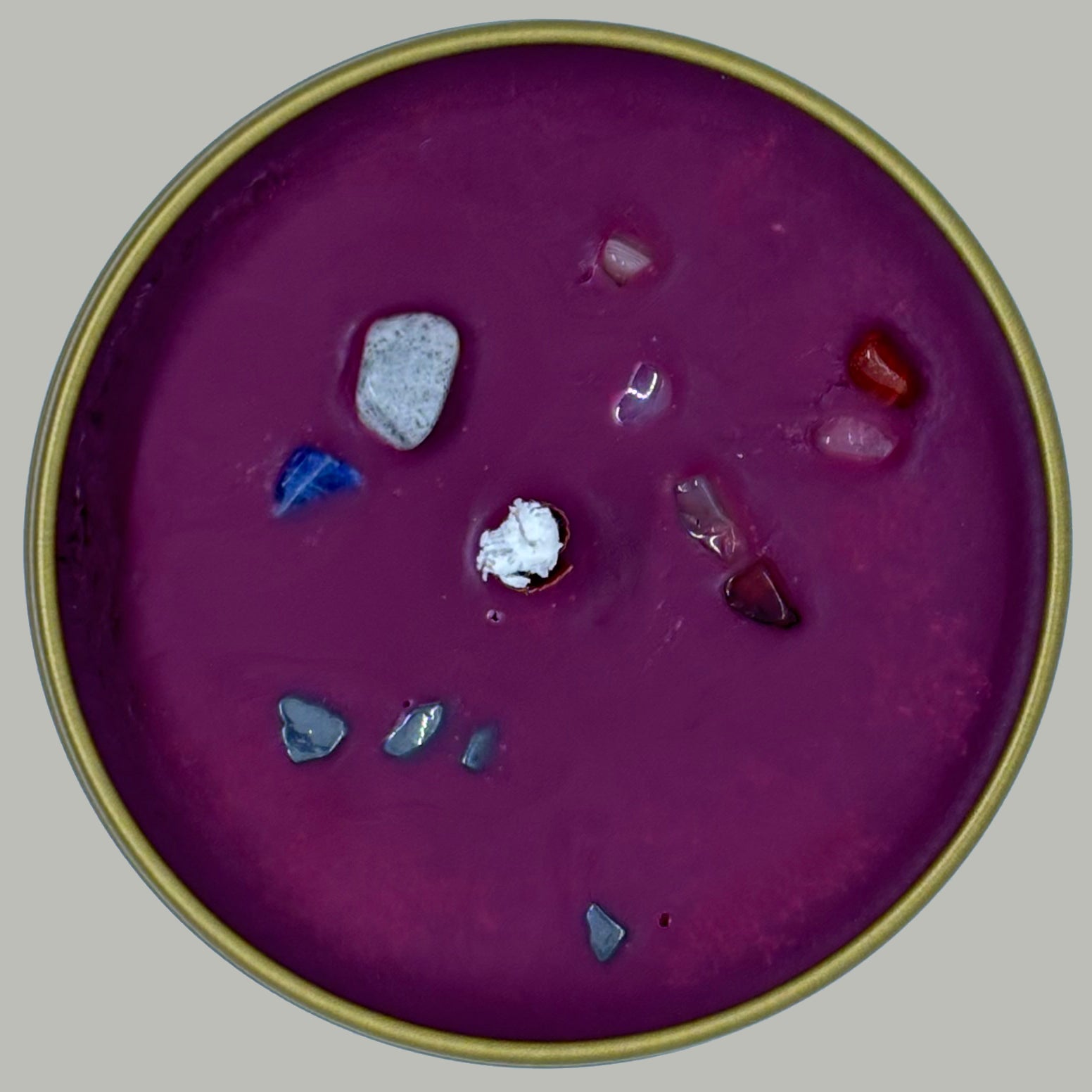 This candle is finished with Hematite, for harmony of mind, body and spirit, Carnelian for courage, confidence and motivation and lastly, Sodalite, for strength and sustenance.