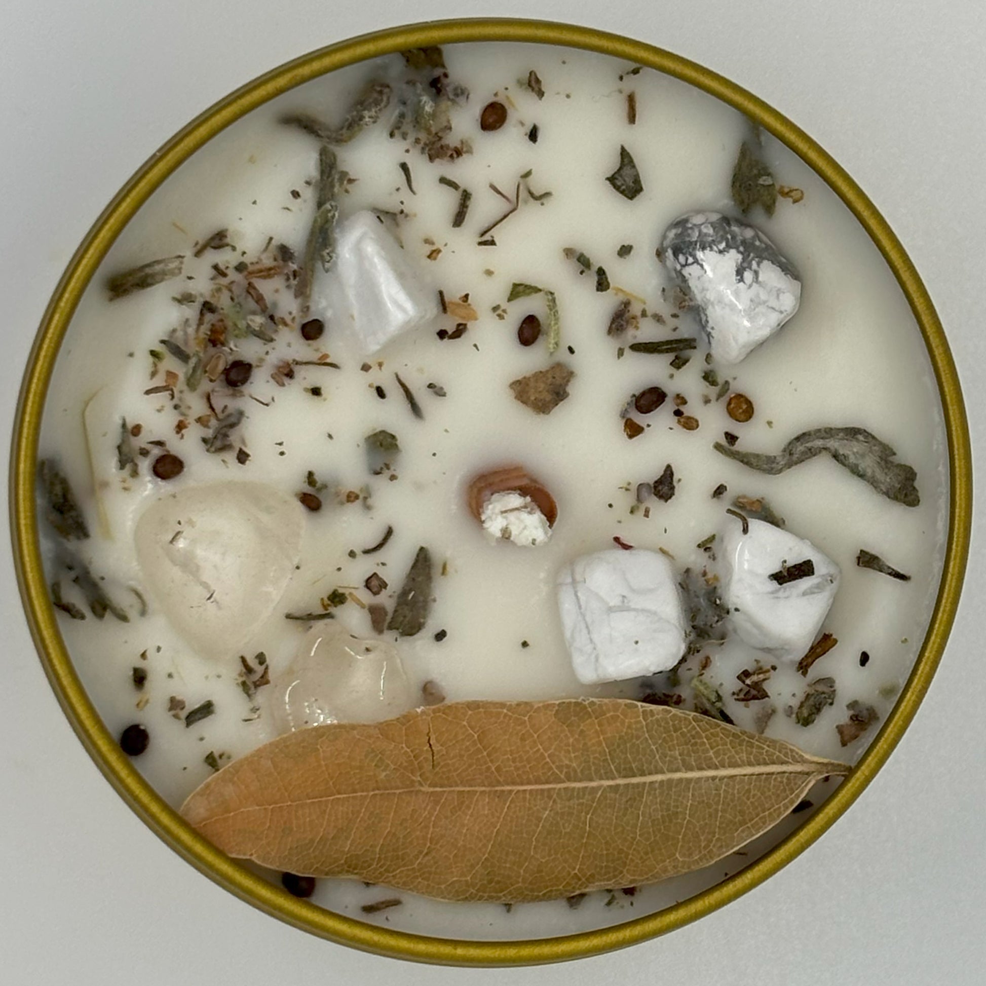 This candle is prepared with sea salt for its long history of purification, protection and blessings. Pinecone is used for protection and preparation to receive enlightenment. The scent of fire releases the past and fosters clarity. Sandalwood assists in maintaining peace of mind throughout the journey.