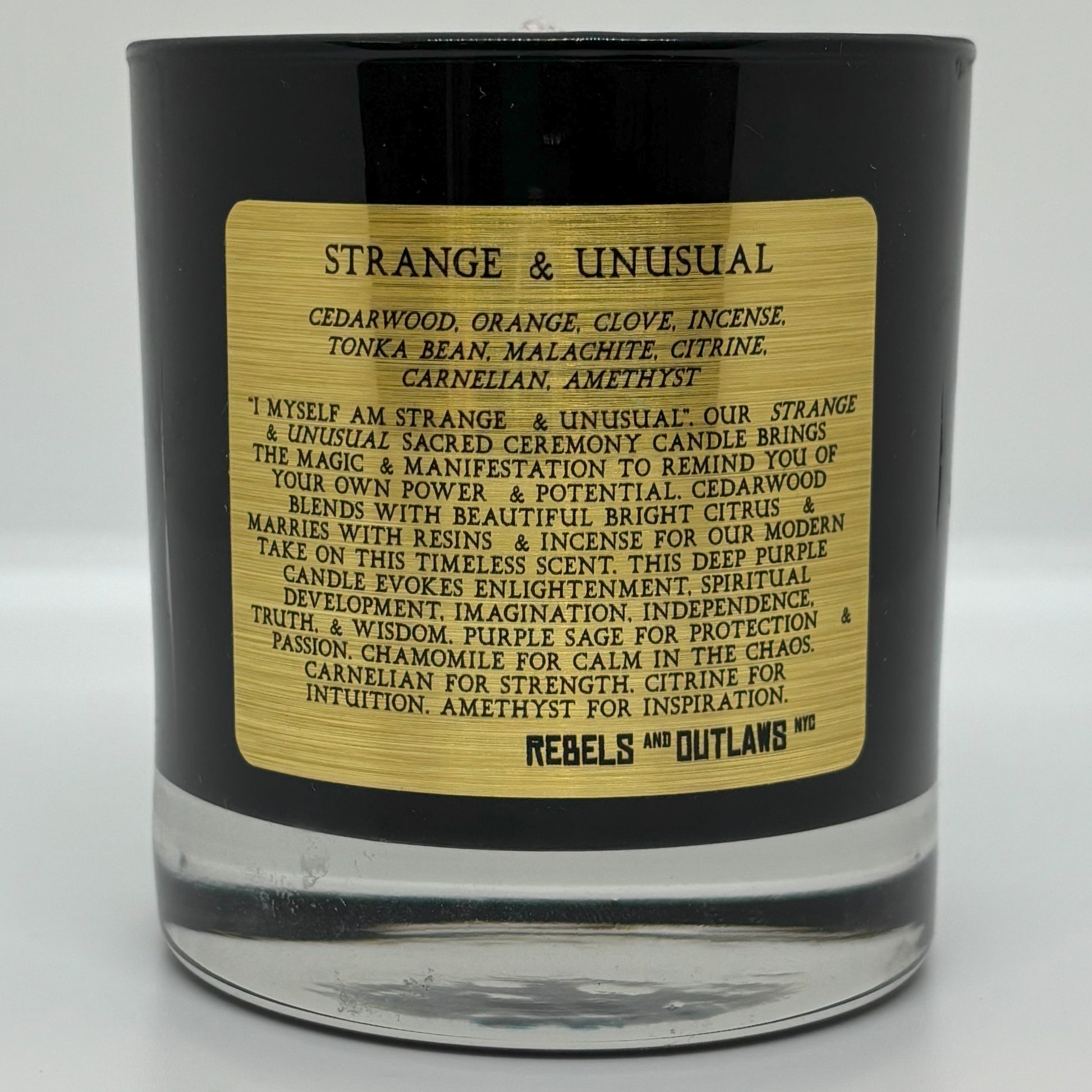 Our Strange & Unusual Sacred Ceremony Candle brings the magic & manifestation to remind you of your own power & potential. Cedarwood blends with beautiful bright citrus & marries with resins & incense for our modern take on this timeless scent. This deep purple candle evokes Enlightenment, Spiritual Development, Imagination, Independence, Truth, & Wisdom. Purple sage for protection & passion. Chamomile for calm in the chaos. Carnelian for Strength. Citrine for intuition. Amethyst for inspiration.