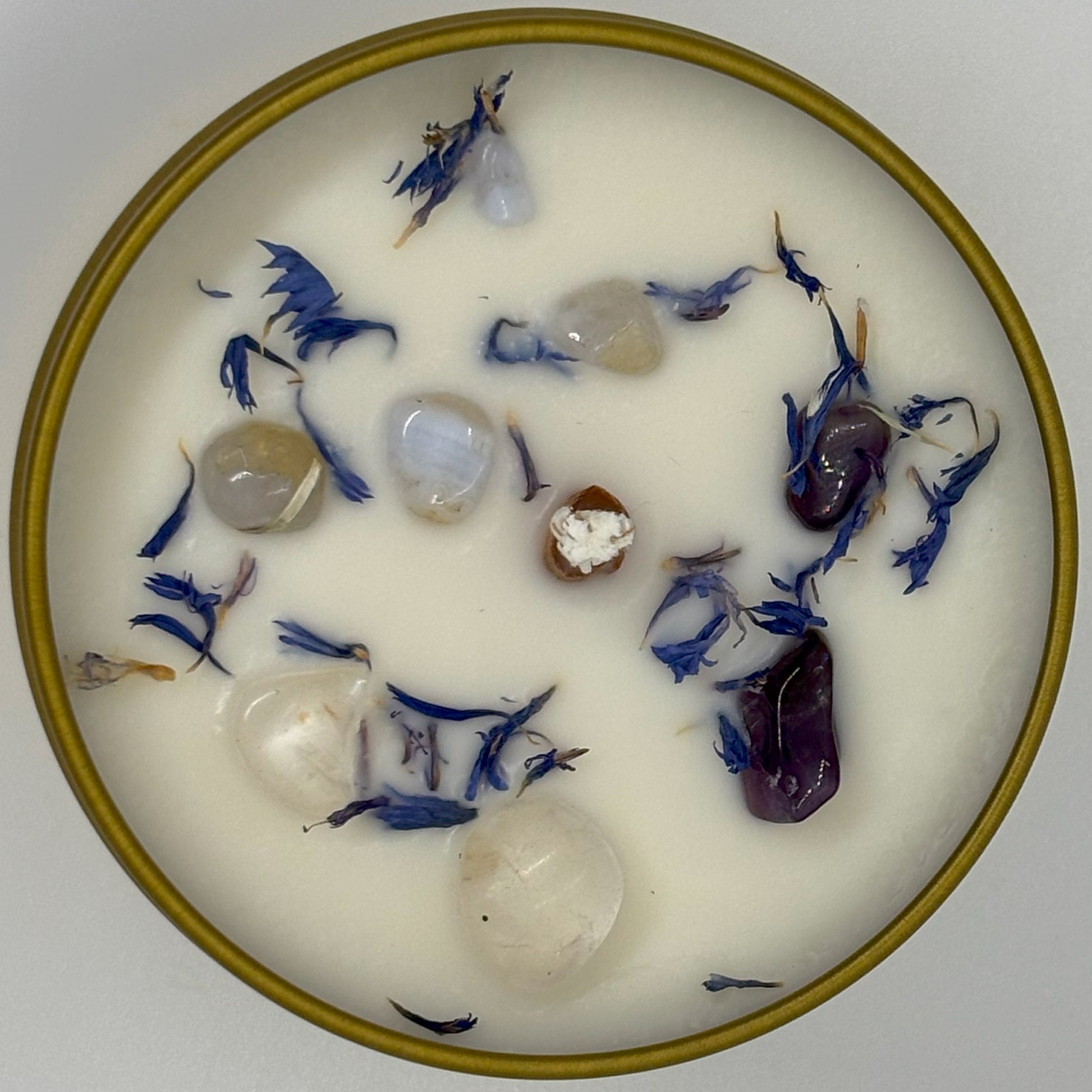 This candle is prepared with the scent of Sweetgrass, a most magical tool, is for elevating our consciousness and connection with higher entities, Violets are added for good luck and the enhancement of spiritual prophecy. It is finished with blue cornflower for further spiritual connection, Clear Quartz to rid the mind of negativity and clear the way for spiritual reception. Lastly, Angelite is used to facilitate contact with the spiritual realm.